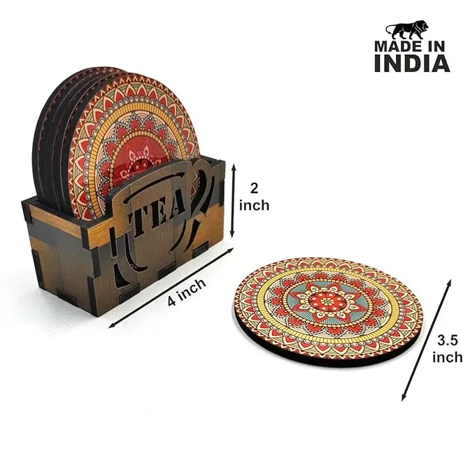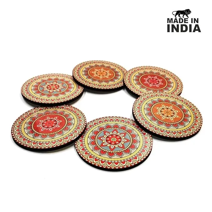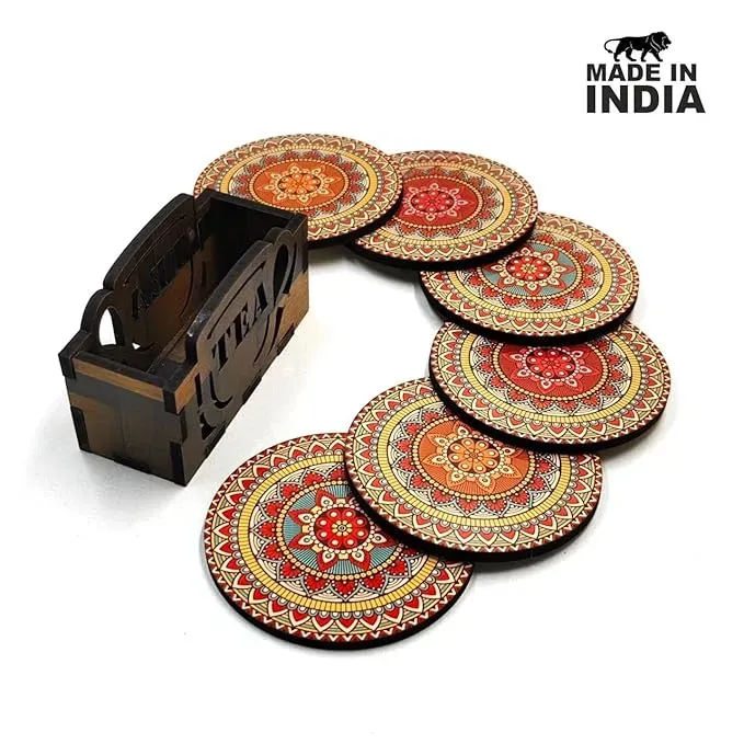 Feature Details Material High-quality sustainably sourced wood Design Handcrafted intricate mandala pattern Set Includes 6 round coasters + 1 wooden stand Dimensions 3.5 x 3.5 inches Finish Smooth edges and polished surface Eco-Friendly Yes – supports sustainable artisan work Made in India A Simple Way to Add Style to Your Space